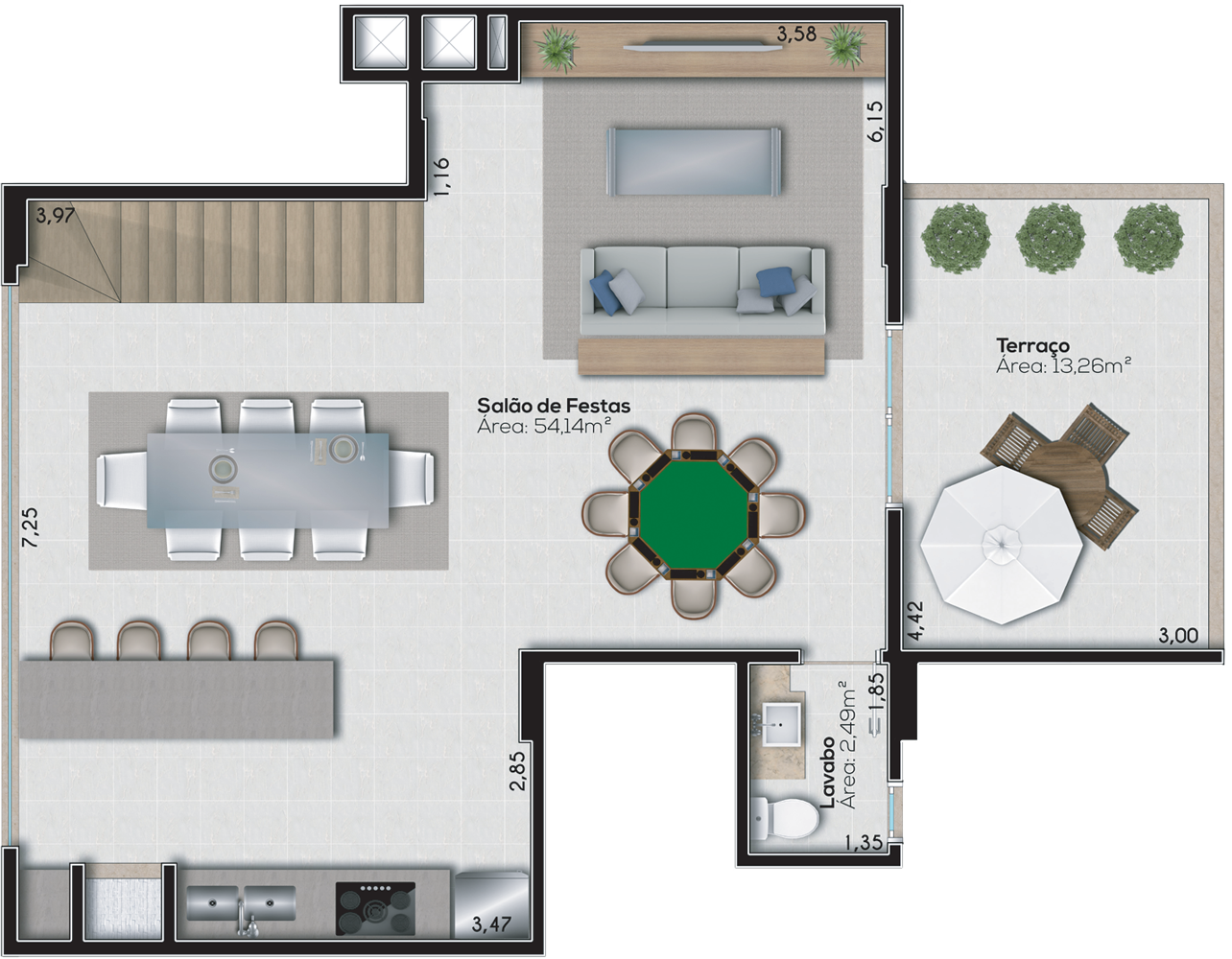 Três espaços externos de lazer e convivência