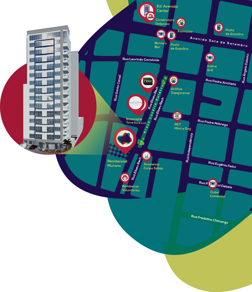 O Edifício Murano está localizado na Av. Eliseu Rech, 234, próximo a Praça Lucélia Poletto, no Centro de Tapejara.